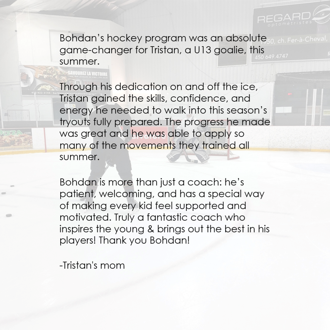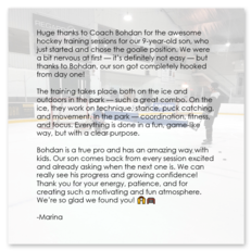 • 2012-2015: Building our own comprehensive strategic approach that combines European and high-tech Canadian-American approaches to training hockey players, both forwards and goaltenders.